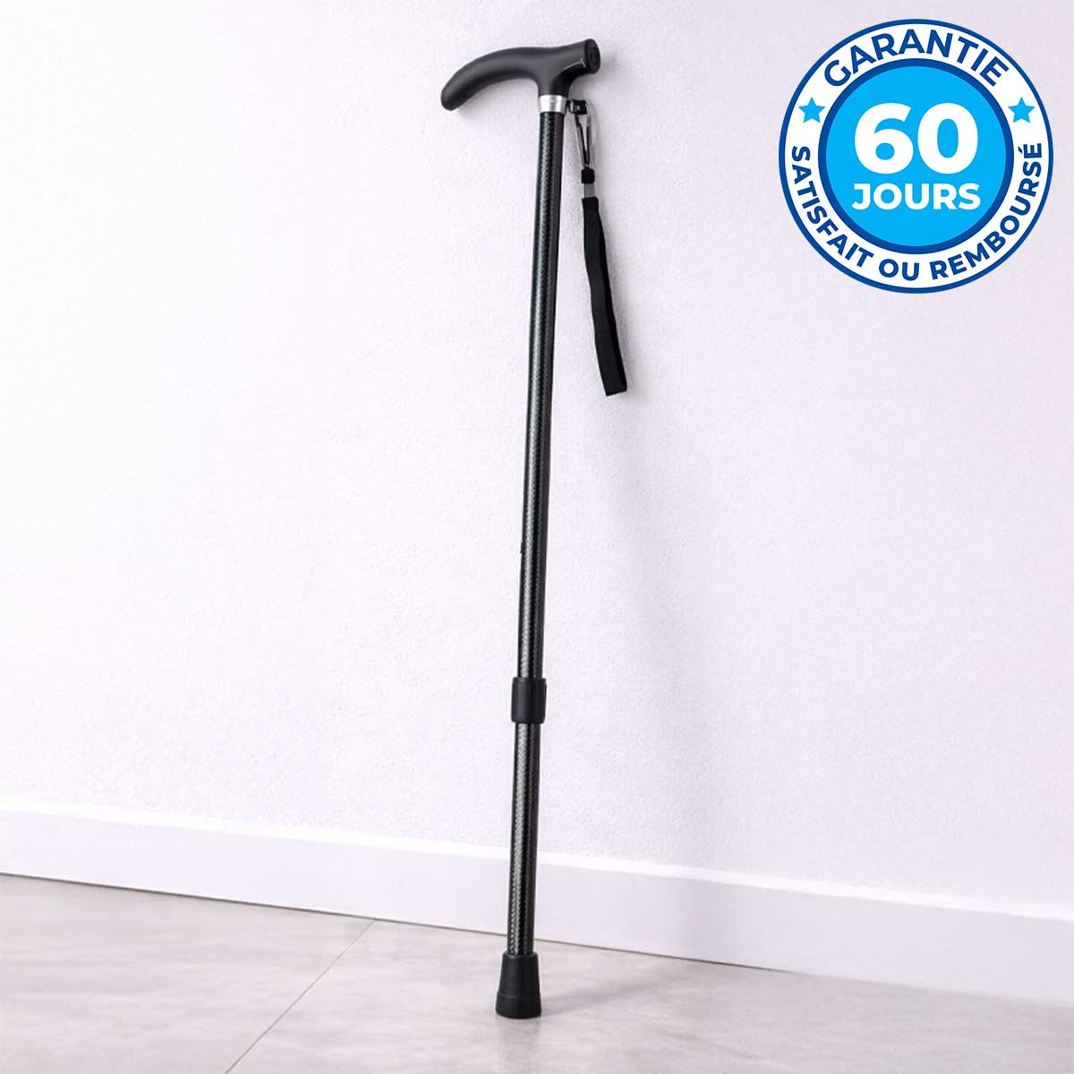 Cette canne en fibre de carbone utilise un matériau aéronautique haute performance : 3x plus légère que l'acier, elle ne pèse que 322g tout en supportant jusqu'à 150 kg. Design moderne et sportif pour les seniors actifs.