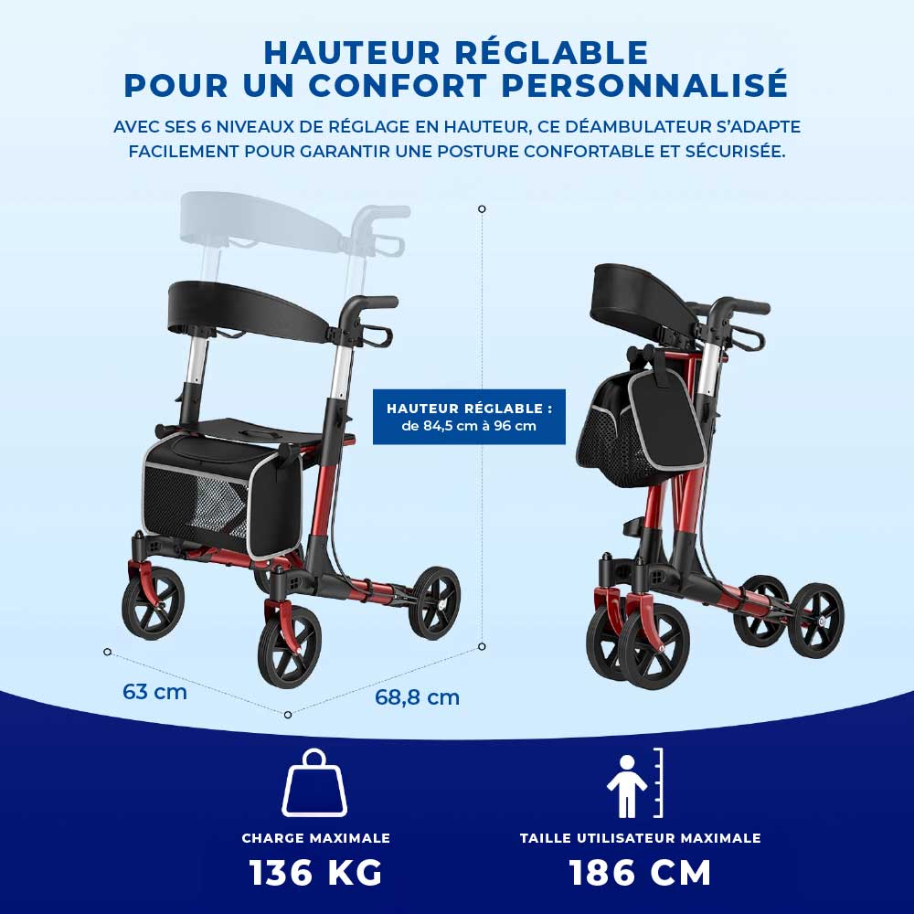 Pensé pour être pratique et fonctionnel, ce rollator dispose d’un siège intégré avec dossier, de freins à main avec système de verrouillage et d’un pliage rapide en un geste pour faciliter le transport et le rangement. Élégant, facile d’entretien et bien dimensionné, c’est un accessoire fiable et pratique pour différents usages au quotidien.